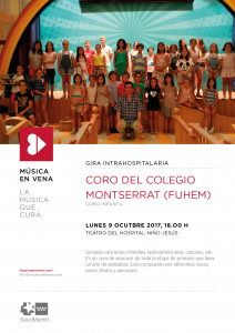 La Asociación Música en Vena, dedicada a llevar la música a las secciones infantiles de los hospitales, nos pidió la organización de un pequeño concierto en el Hospital Niño Jesús para el 9 de octubre. El coro cantará las canciones que estuvo trabajando en el curso anterior, añadiendo alguna nueva. Contamos en esta ocasión con un pequeño grupo instrumental (flauta, cello, cajón flamenco, percusión y piano.